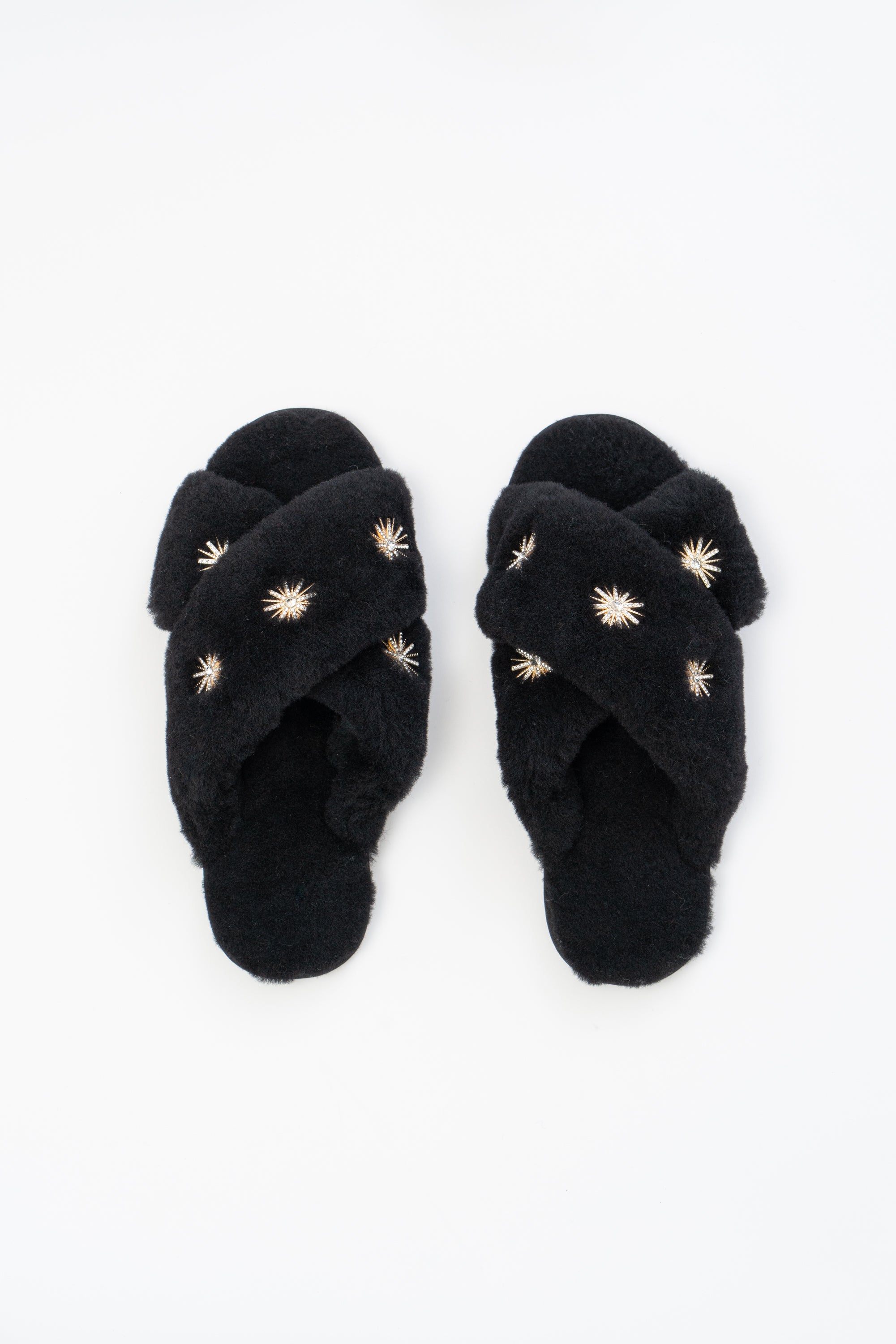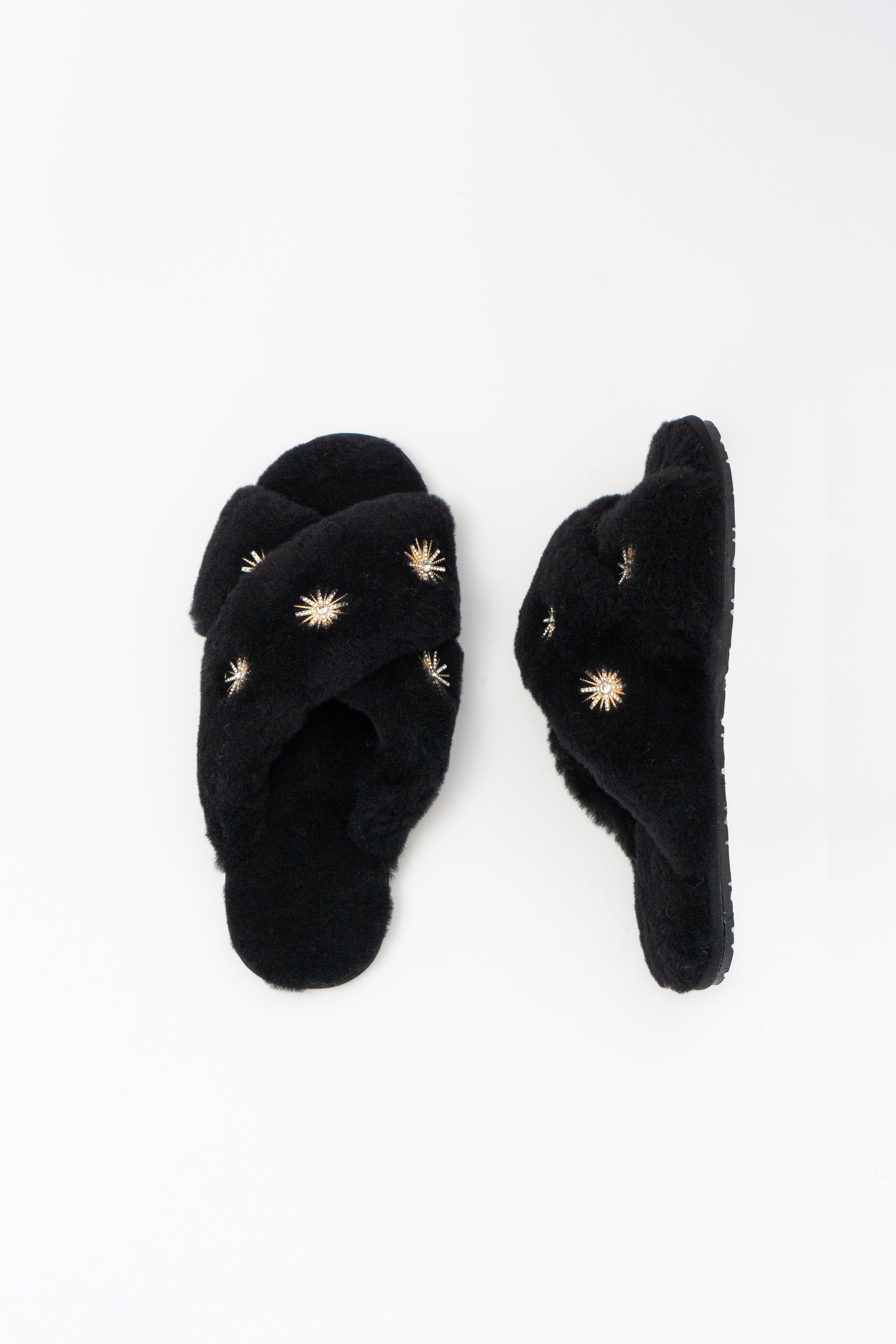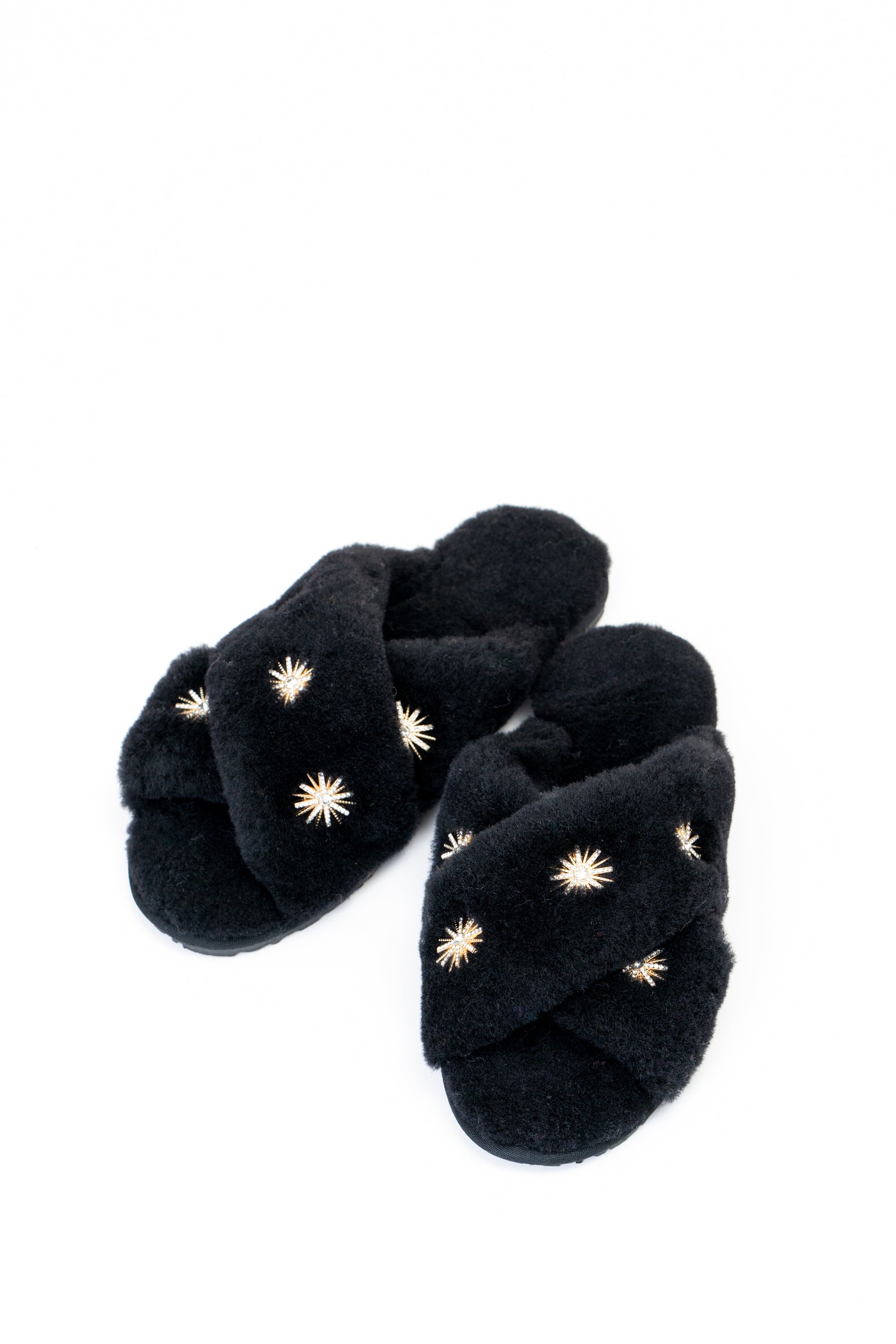 Step into holiday comfort and sparkle. Our Sheepskin Rhinestone Snowflake Slippers combine ultra-soft sheepskin with hand-placed crystal snowflake rhinestones for a festive, elegant shine. Designed for everyday wear, the plush shearling interior hugs your feet in warmth, while the durable non-slip rubber sole offers secure indoor-to-porch versatility.